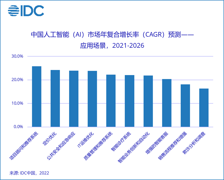 IDC估计,专业服务、政府、金融和电信四大终端职业用户的AI相关开销在五年猜测期内将继续坚持抢先,四者算计超越我国AI商场总开销规划的六成。详细而言,地方政府AI开销将以24.3%的五年CAGR引领AI出资增加,2026年估计开销超25.1亿美元;中央政府五年CAGR估计为19.4%,2026年估计开销将到达13.7亿美元。以银行为代表的金融职业商场规划也将在未来几年继续增加,五年CAGR估计超越21.0%。除此之外,建筑业、离散制作和医疗保健职业也完结了较高增速,一起促进了我国人工智能的开展和使用落地。未来人工智能将会深度渗透到各个职业范畴,趋向广泛化、笔直化。进一步有用支撑工业完结智能化营销、决议计划等环节。一起人工智能和职业的深度交融将会激宣布更多潜力,孕育宽广商机。