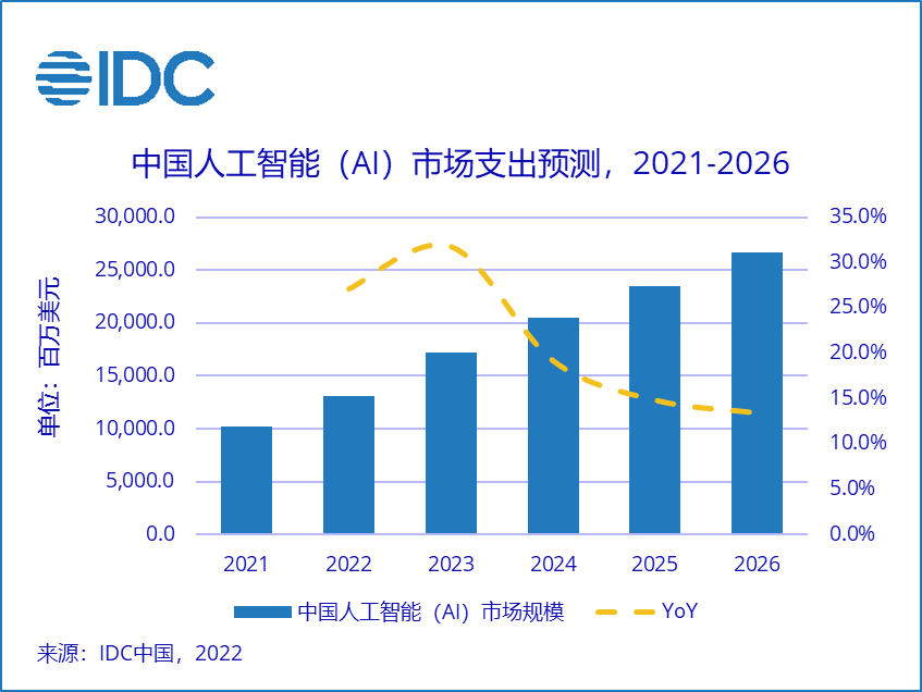 IDC于近来发布了2022年V2版IDC《全球人工智能开销攻略》(IDC Worldwide Artificial Intelligence Spending Guide)。数据显现,2021年全球人工智能IT总出资规划为929.5亿美元, 2026年估计增至3014.3亿美元,五年复合增加率(CAGR)约为26.5%。聚集我国商场,IDC估计,2026年我国AI出资规划有望到达266.9亿美元,全球占比约为8.9%,位列全球单体国家第二。近年来越来越多的企业投身于 “数智化年代”,企业开端布局数字化转型以及智能化晋级,然后催生出对人工智能更多的需求。受方针、技能、商场等要素驱动,人工智能赋能工业正成为干流开展趋势。