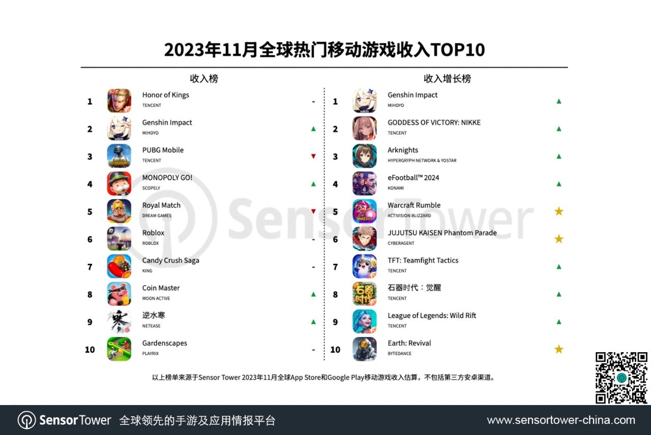 米哈游《原神》回归榜单第2名。其间,45.6%的收入来自我国iOS商场,日本商场的收入占22.4%,美国商场占10.2%。11月8日,该游戏发布了4.2版别,引入了新地图、芙宁娜等新人物和道具。这些活动使得游戏在11月收入榜上跃居第2,并荣登收入增加榜第一。